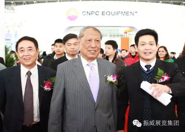 振威展覽股份總裁張學山陪同第九屆、十屆全國人大常委會成思危副委員長(中),中國工程院院士、中國海洋石油有限公司周守為原總裁(左一)參觀cippe振威國際石油展