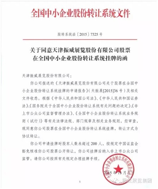 2015年11月24日,天津振威展覽股份有限公司成功登陸新三板,在全國中小企業(yè)股份轉(zhuǎn)讓系統(tǒng)掛牌上市。證券簡稱:振威展覽,證券代碼為:834316,交易方式為協(xié)議交易。