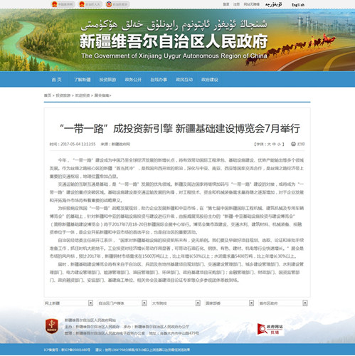 新疆政府網刊文:一帶一路”成投資新引擎 新疆基礎建設博覽會7月舉行