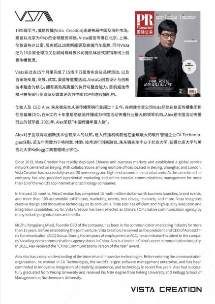 振威國際會展集團作為業界領先的全球會展綜合服務商,2020年布局創意傳播、營銷管理領域,成立威信傳播(Vista Creation)咨詢機構。作為中國領先的創意傳播營銷管理咨詢機構,威信傳播(Vista Creation)在過去16個月里完成了15場千萬級發布會及品牌活動,以及百余場車展、商展、試駕、渠道等重要活動。Vista以創意設計與創新技術融合為核心,擁有高效高質量的執行與整合能力。目前威信傳播已被多家行業組織及媒體評選為中國TOP創意傳播機構。