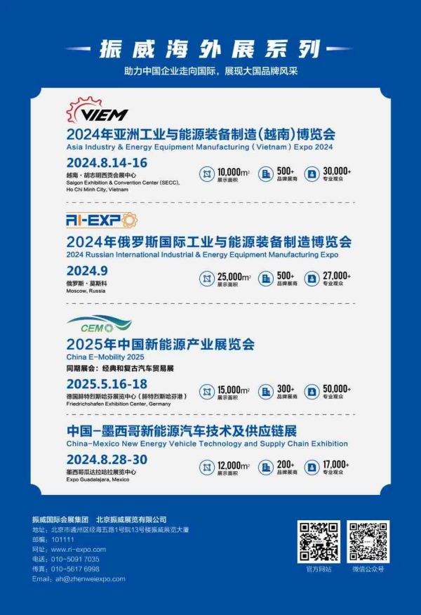 振威會展作為全球會展綜合服務(wù)商積極布局境外展會,2024年還將在越南、俄羅斯、墨西哥等多地籌備裝備制造與新能源產(chǎn)業(yè)展會。截至目前,振威會展旗下2024年亞洲工業(yè)與能源裝備制造(越南)博覽會、2024年俄羅斯國際工業(yè)與能源裝備制造博覽會已被國內(nèi)多地政府列入境外展覽重點支持目錄。中國-墨西哥新能源汽車技術(shù)及供應(yīng)鏈展也在緊鑼密鼓地籌備之中。
